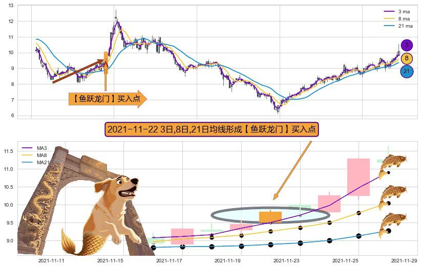 ⚀ 2021-11-22日显现 3日-8日-21日均线 【鱼跃龙门】买入点 看多信号,后市看涨,买入