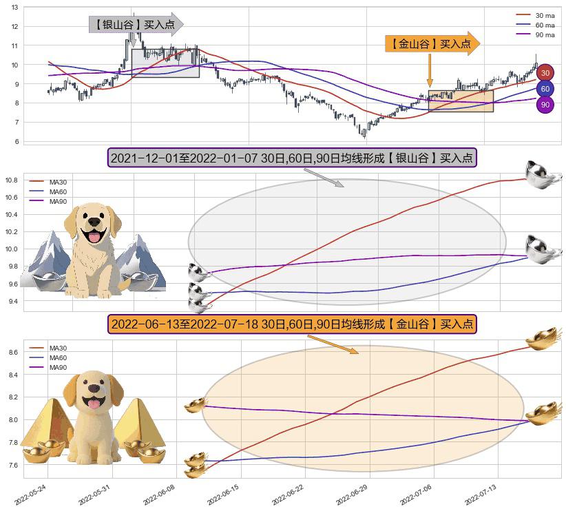 ⚃ 2022-06-14-日至2022-07-18-日显现 30日-60日-90日均线 【金山谷】买入点 其再次确认了买入信号,可靠性更强,买入