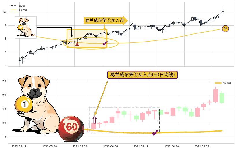 ⚀ 2022-05-30-日显现 葛兰威尔均线 60日均线 第买①入点 走势反转见底信号,后市看涨,买进信号