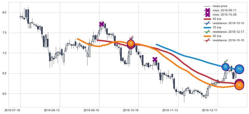 ⚃ 在突破点附近ma依然下降趋势比较明显,平稳迹象是在突破后一段时间后出现,信号【可信度低】