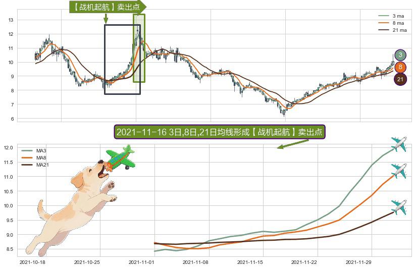 ⚀ 2021-11-01日-2021-12-01日显现 3日-8日-21日均线 【战机起航】卖出点 看空信号,后市看跌,卖出