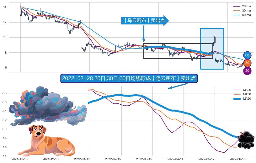 ⚀ 2022-01-10日-2022-06-13日显现 20日-30日-60日均线 【乌云密布】卖出点 看空信号,后市看跌,卖出