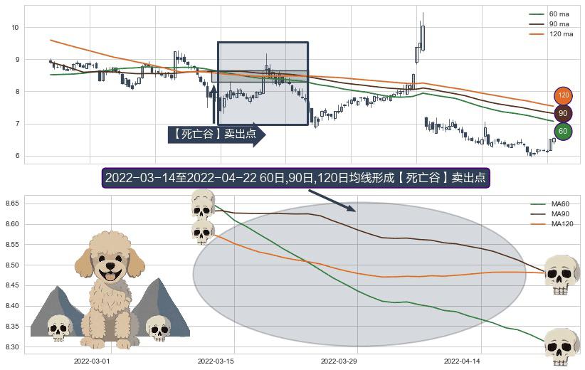 ⚀ 2022-03-15-日至2022-04-22-日显现 60日-90日-120日均线 【死亡谷】卖出点 看空信号,后市看跌,卖出