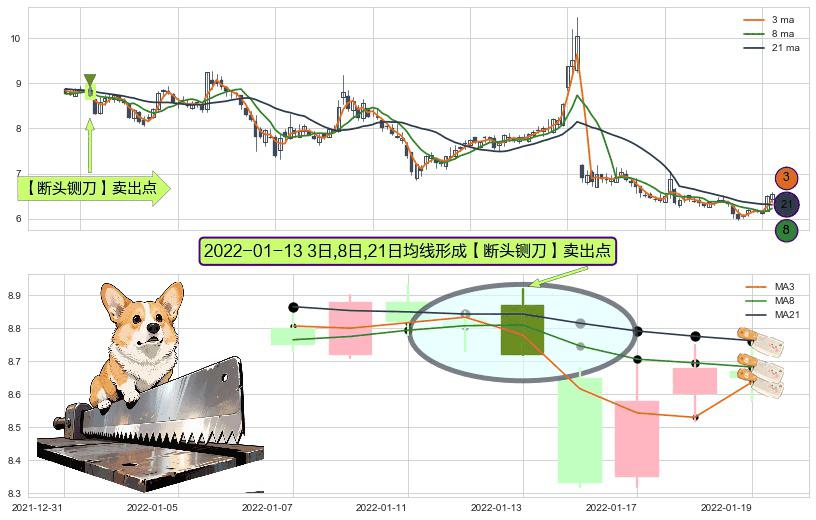 ⚀ 2022-01-13日显现 3日-8日-21日均线 【断头铡刀】卖出点 看空信号,后市看跌,卖出