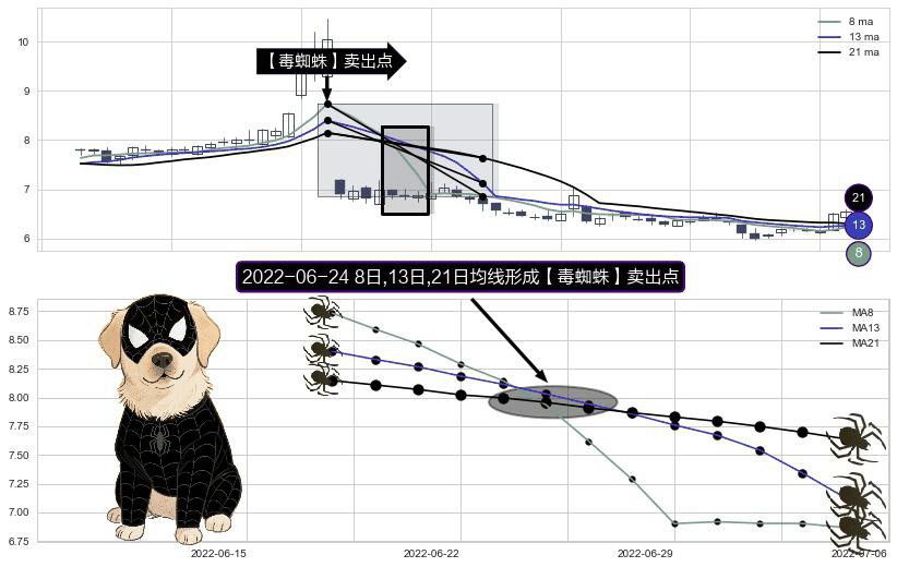 ⚀ 2022-06-24日显现 8日-13日-21日均线 【毒蜘蛛】卖出点 看空信号,后市看跌,卖出