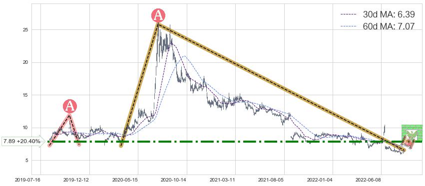 2022-01-28: 第一阻力位7.89有效抑制了下跌浪,成功阻止了价格的继续下跌。