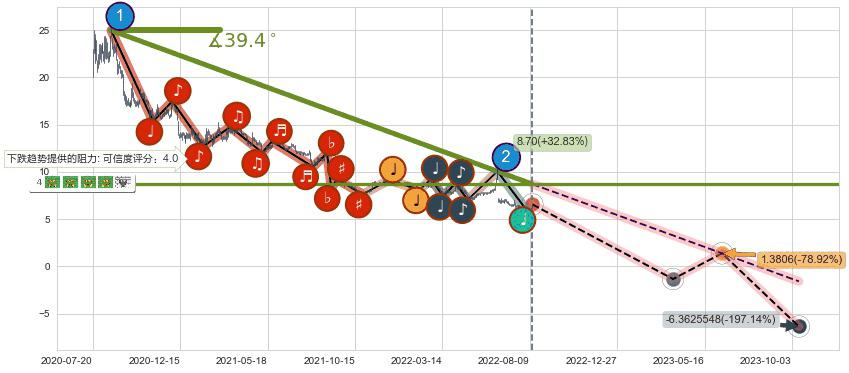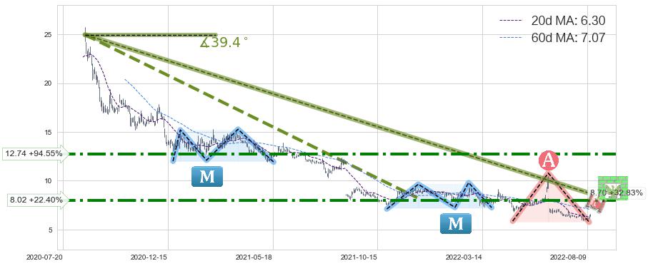 ♘ 在最后的下跌阶段2020-08-18至2022-08-12,存在 持续未破位的阻力位 ,阻力价格8.70,可信任强度86.18%,其距离最后价格6.55相差 +32.83%