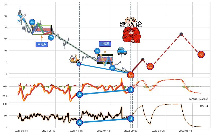➣ 【中枢B】:2022-01-28-2022-04-26,中枢由5笔构成,共56交易日, ZG=8.81, ZD=8.08