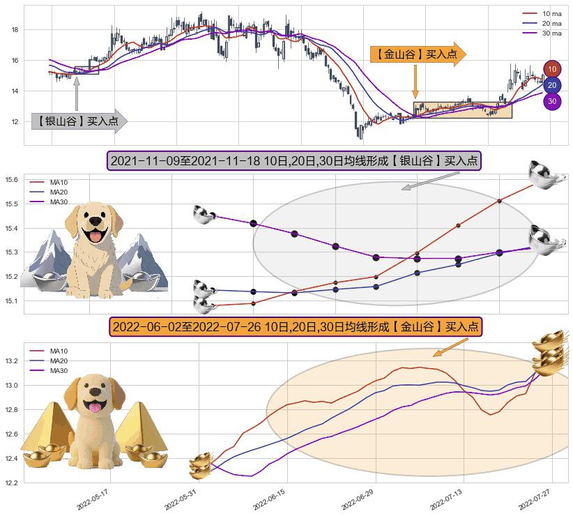 ⚃ 【金山谷】买入点短期均线上穿中长均线,中期均线上穿长期均线形成的三个交叉中仅有两个 黄金交叉
