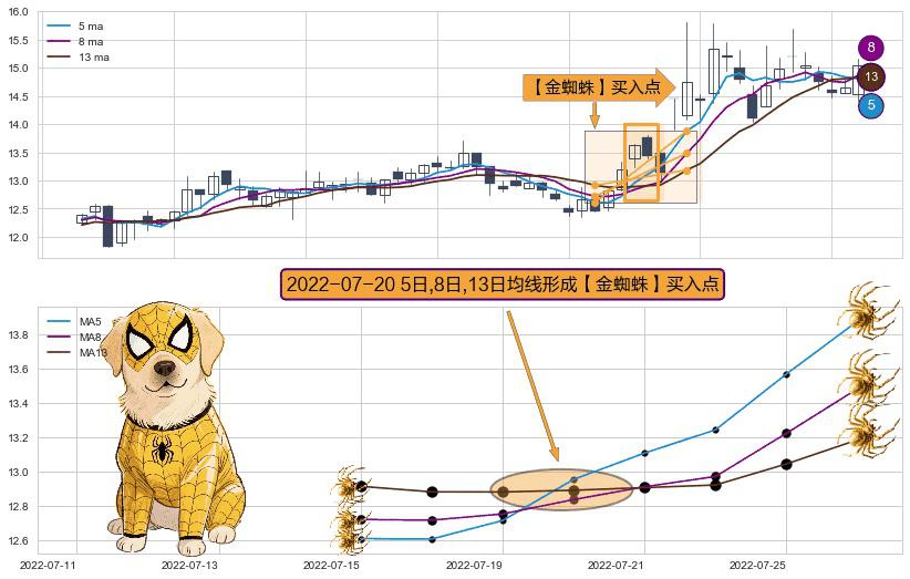 形态多维评估: ⚀ 2022-07-20日显现 5日-8日-13日均线 【金蜘蛛】买入点 看多信号,后市看涨,买入