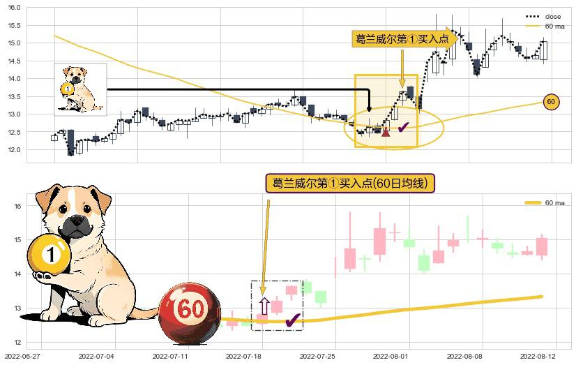 形态多维评估: ⚀ 2022-07-18-日显现 葛兰威尔均线 60日均线 第买①入点 走势反转见底信号,后市看涨,买进信号