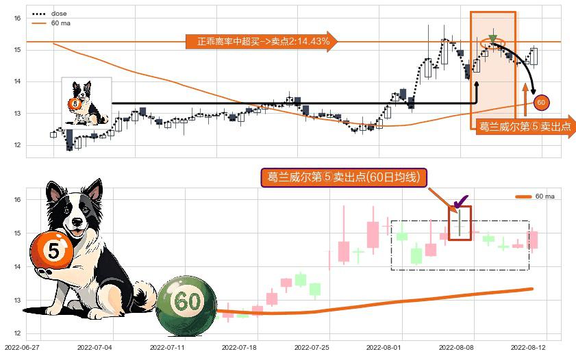 形态多维评估: ⚀ 2022-08-05-日显现 葛兰威尔均线 60日均线 第⑤卖出点 上升趋势均值回复的短线回落信号,后市看跌,卖出信号