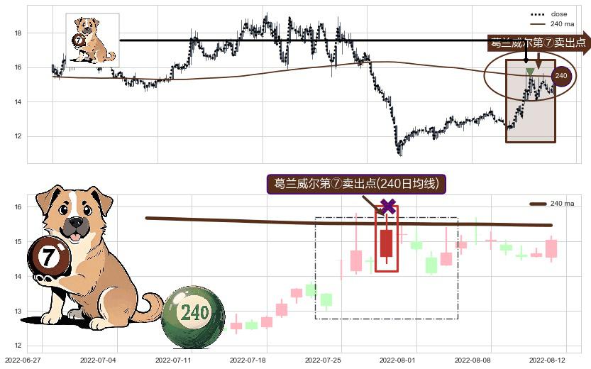 形态多维评估: ⚀ 2022-07-28-日显现 葛兰威尔均线 240日均线 第⑦卖出点 下降趋势的中继信号,后市看跌,卖出信号