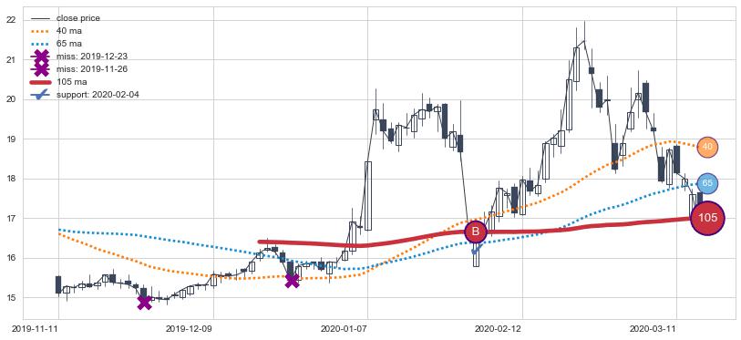 上涨趋势2021-05-07-2021-07-22,均线65, 105, 40确认关键支撑2处