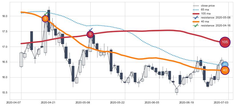 下跌趋势2020-04-07-2020-07-03,均线40, 105确认关键阻力2处