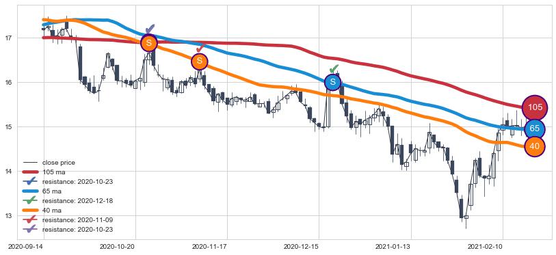 下跌趋势2020-09-14-2021-02-24,均线65, 105, 40确认关键阻力3处