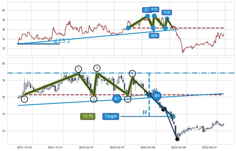 ➢ 【卖1】: 激进型 卖点→(2022-03-29: 16.30 )形成突破三重顶【反转】形态