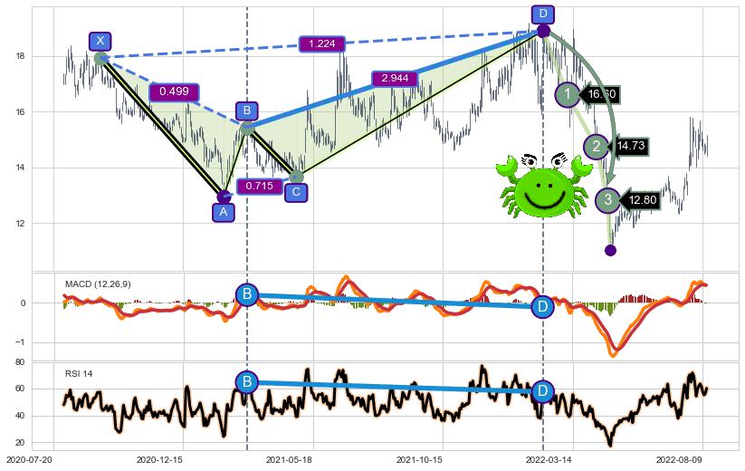 ➢ 谐波价格D点比B点高 ⤴,【MACD】指标D点比B点低 ⤵️