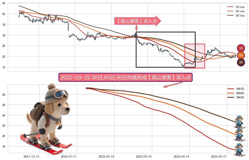 ⚀ 2022-01-18日-2022-05-24日显现 30日-60日-90日均线 【高山滑雪】买入点 看多信号,后市看涨,买入