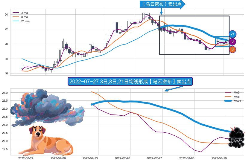 ⚀ 2022-07-12日-2022-08-11日显现 3日-8日-21日均线 【乌云密布】卖出点 看空信号,后市看跌,卖出