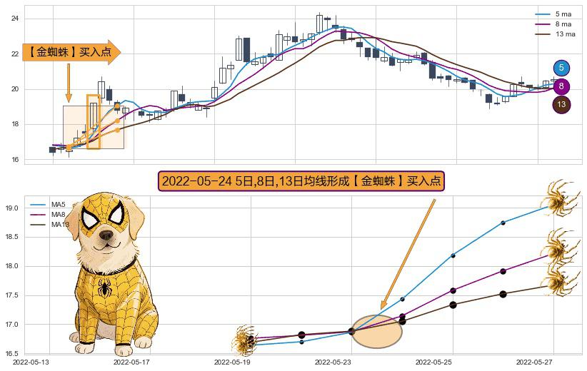 ⚀ 2022-05-24日显现 5日-8日-13日均线 【金蜘蛛】买入点 看多信号,后市看涨,买入