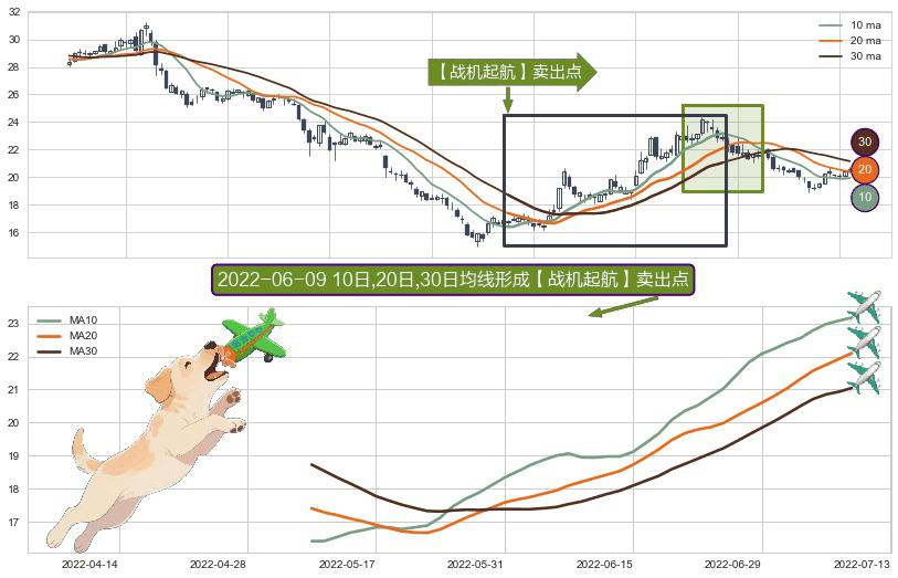 ⚀ 2022-05-10日-2022-07-08日显现 10日-20日-30日均线 【战机起航】卖出点 看空信号,后市看跌,卖出