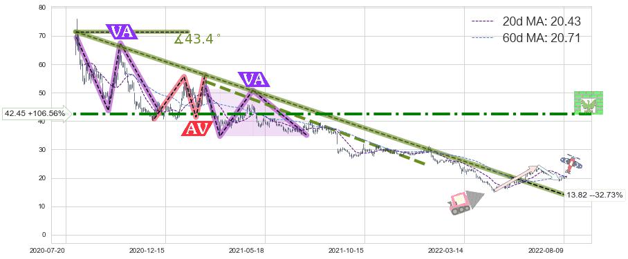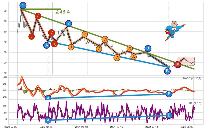 从2020-08-03至2022-05-24,共包含437个交易日,阶段股价下跌-115.58%,阶段股价变动位移路程比: 1 : 7,下跌趋势角度: 43.4