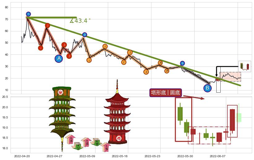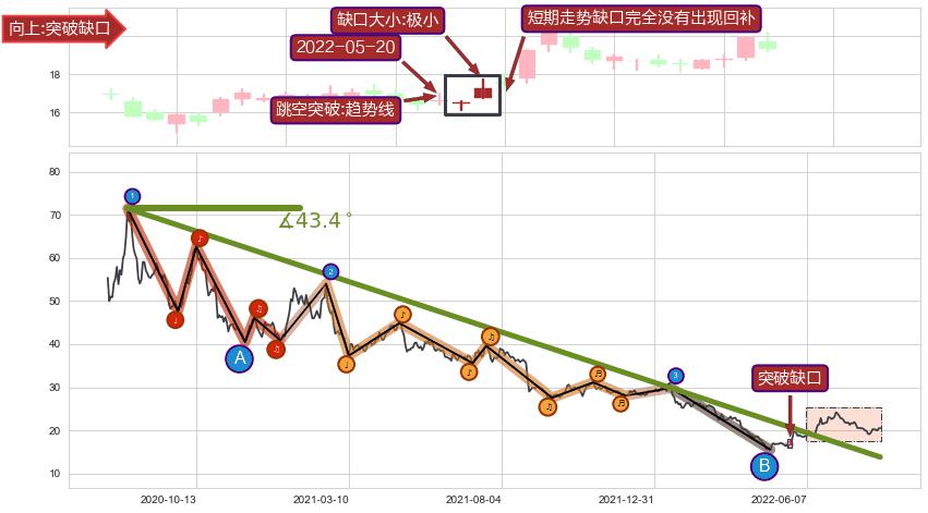 ➣ 2020-08-03-2022-05-24下跌趋势存在反转上涨[机会],其原下跌趋势的阻力位(13.82)已被突破[强支撑信号],原下跌趋势角度: 43.4˚