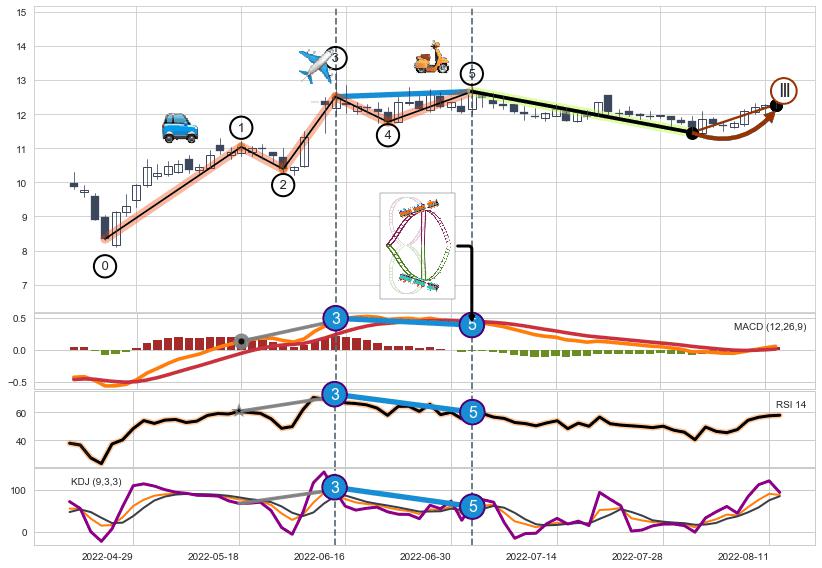 ➢ 1,3,5驱动浪MACD, RSI, KDJ走势都出现【常规背离】反转信号增强