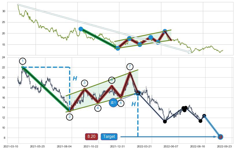 ➣ 最小中继整理跌幅→𝐇: 8.73 (𝐇旗杆的长度:旗杆起点→顶点)