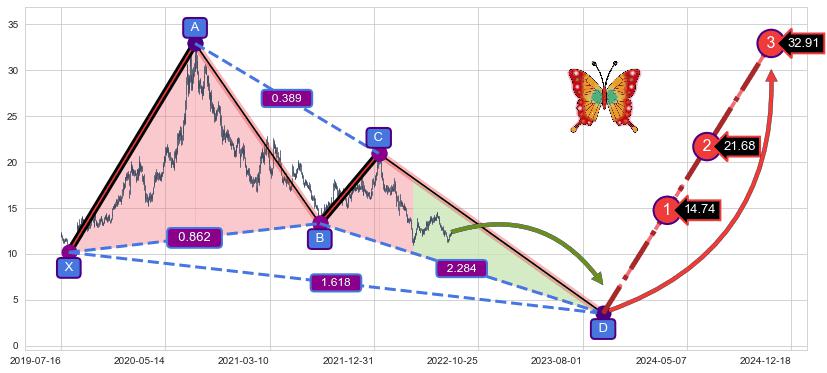 ➣ 未完成【蝴蝶】形态起点X: 2019-08-06, 已到达C点: 2022-01-14, 预测最终D点: 2023-09-25, 共951交易日