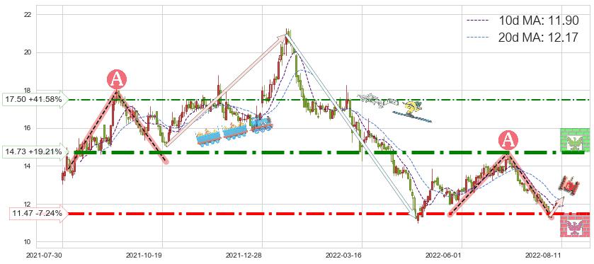 ♘ 阻力价格位17.50,可信任强度54.83%,距离最后交易2022-08-12形成的收盘价格12.36相差 +41.58%