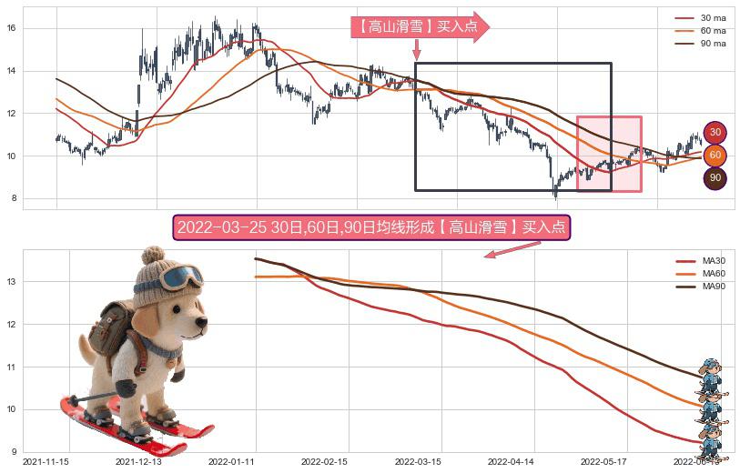 ⚀ 2022-01-11日-2022-06-09日显现 30日-60日-90日均线 【高山滑雪】买入点 看多信号,后市看涨,买入