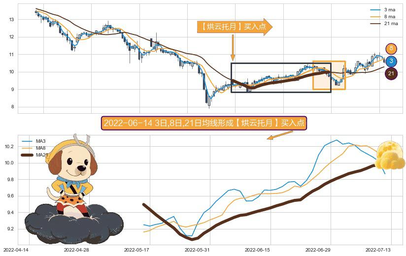 ⚀ 2022-05-16日-2022-07-12日显现 3日-8日-21日均线 【烘云托月】买入点 看多信号,后市看涨,买入