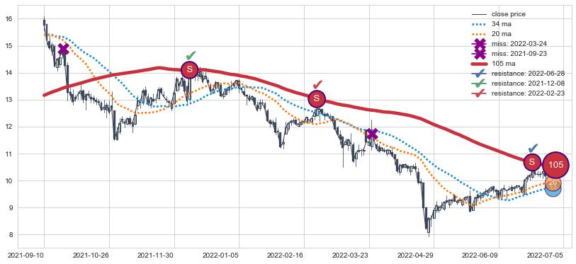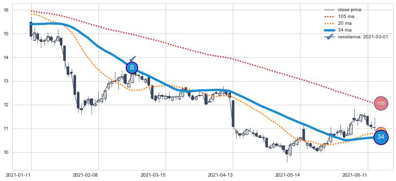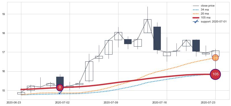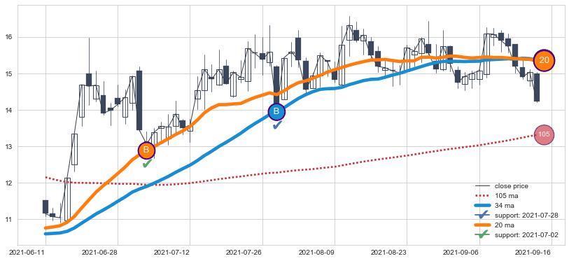 ⚁ MA3和MA8走势平行,且始终保持在短距离内,MA21始终在短中期均线下方,与短中期均线保持一定的距离,微微上行