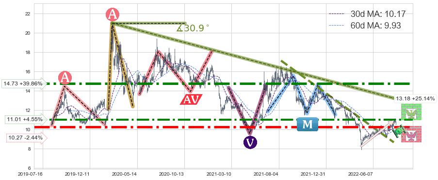 ♘ 阻力价格位14.73,可信任强度89.13%,距离最后交易2022-08-12形成的收盘价格10.53相差 +39.86%