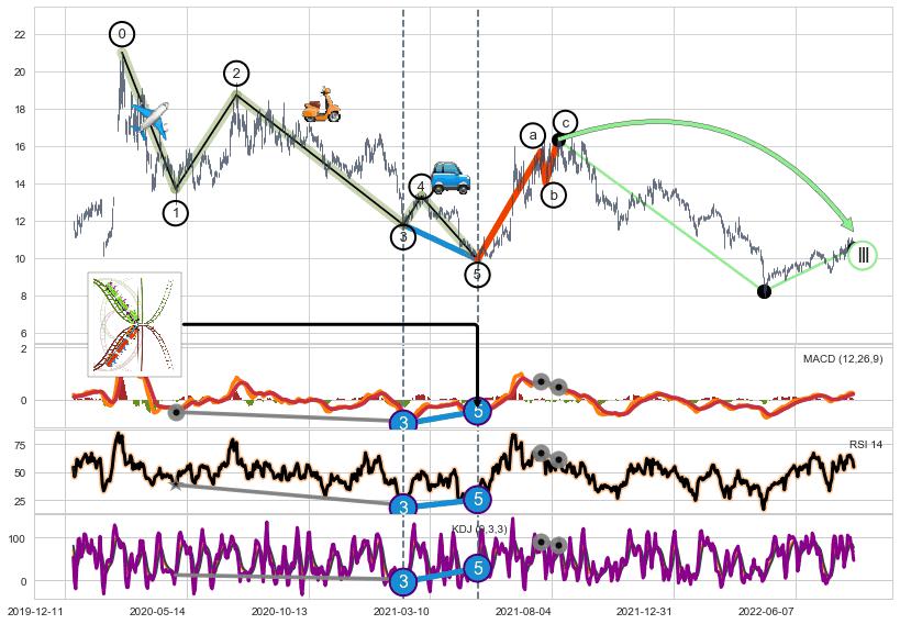 ➢ 1,3,5驱动浪MACD, RSI, KDJ走势都出现【常规背离】反转信号增强