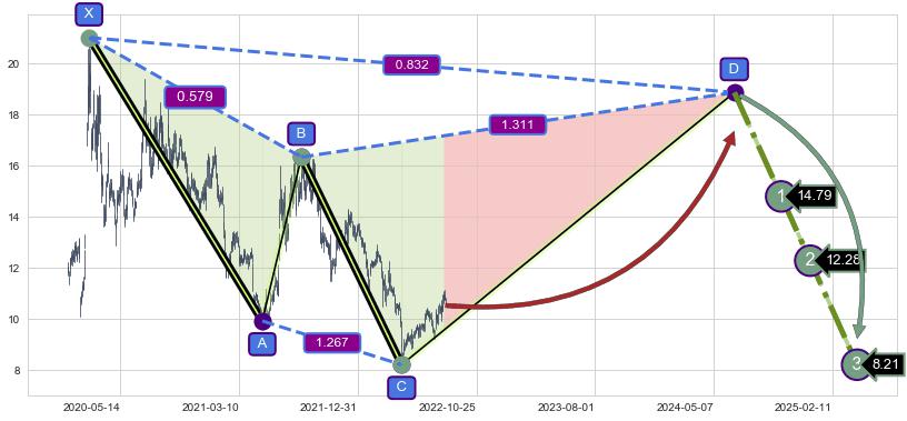 ➢ 距离预测D点位置有足够的上涨空间, 与看跌【赛福】形态相反,实际方向【看涨】