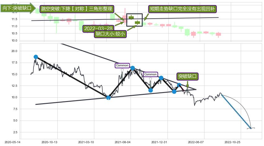 ➣ 【多空双方观望→争持→促使价格波动日益狭窄→空方打破攻守平衡点】对称三角形中继整理, 已在2022-03-14突破【支撑】颈线 11.44 →演变成下降通道