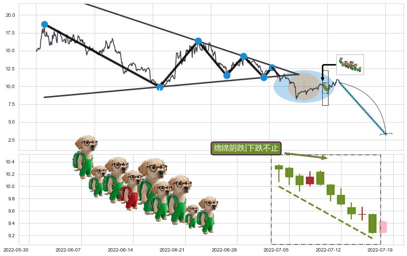 | 8 🅚:三只乌鸦 ➕ 📐:下降对称三角整理下行突破支撑位破位, 猜想持续下沉下跌,被突破的支撑位已变为阻力位 ☞ 看空信号 ⇥ 【🅚线】交织【图形】⇥ 综合量化分数: 45 | > |