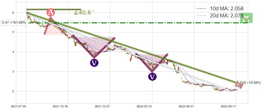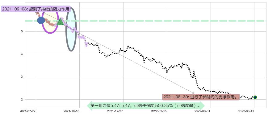 ♘ 阻力价格位5.47,可信任强度56.35%,距离最后交易2022-08-12形成的收盘价格2.090相差 +161.68%
