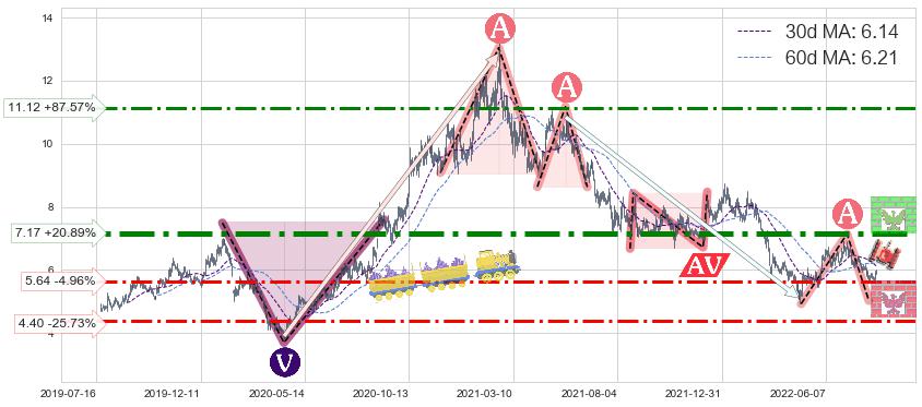 ♘ 阻力价格位7.17,可信任强度86.18%,距离最后交易2022-08-12形成的收盘价格5.93相差 +20.89%