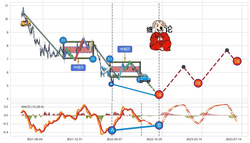 ➢ 【中枢B】:2022-05-24-2022-07-05,中枢由4笔构成,共30交易日, ZG=6.60, ZD=6.22