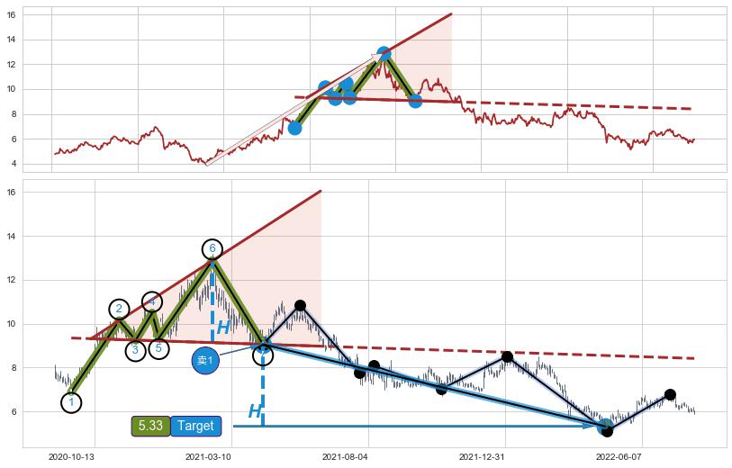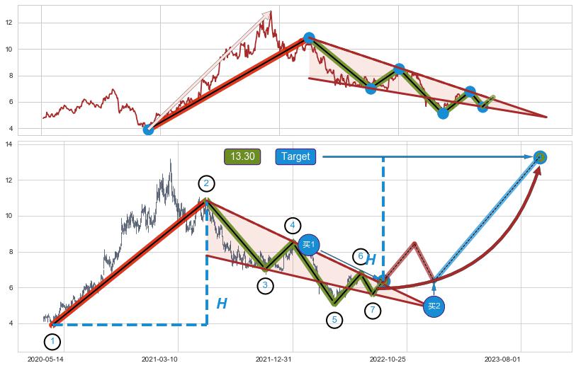 ➣ D点拟合预测价格8.17,距离最后交易收盘价格5.93相差 +37.82%