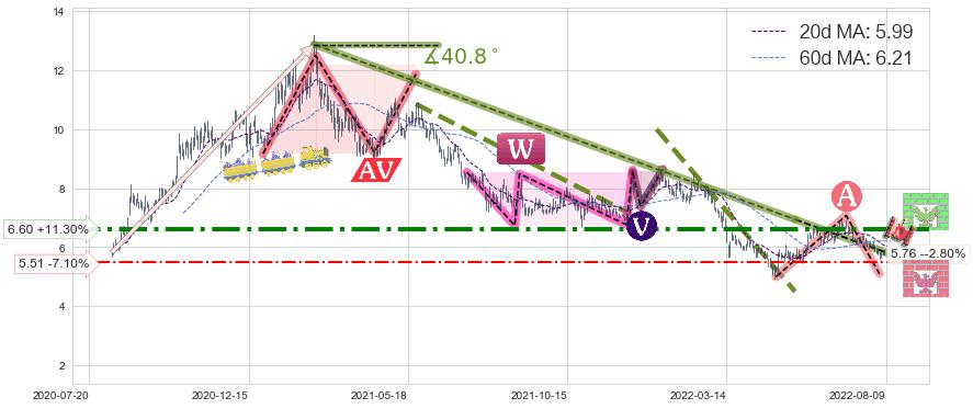➢ 【已达成】最小【整理】第一目标价格→(2022-03-15: 5.80 ), 后续继续【整理】下跌动力微弱,下跌较小