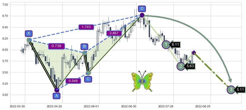 ➣ 已完成【蝴蝶】形态起点X: 2022-04-01, 终点D: 2022-07-05, 共62交易日