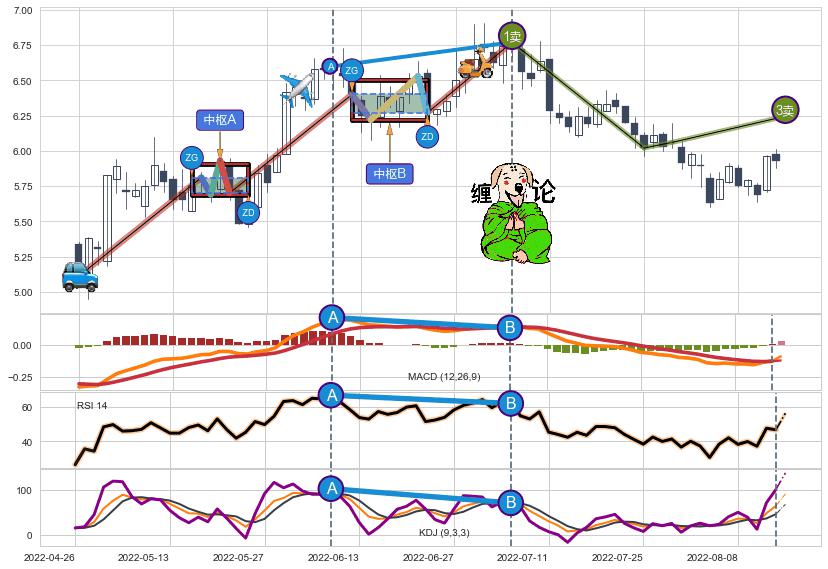 ➣ 【中枢B】:2022-06-10-2022-06-22,中枢由4笔构成,共9交易日, ZG=6.40, ZD=6.27