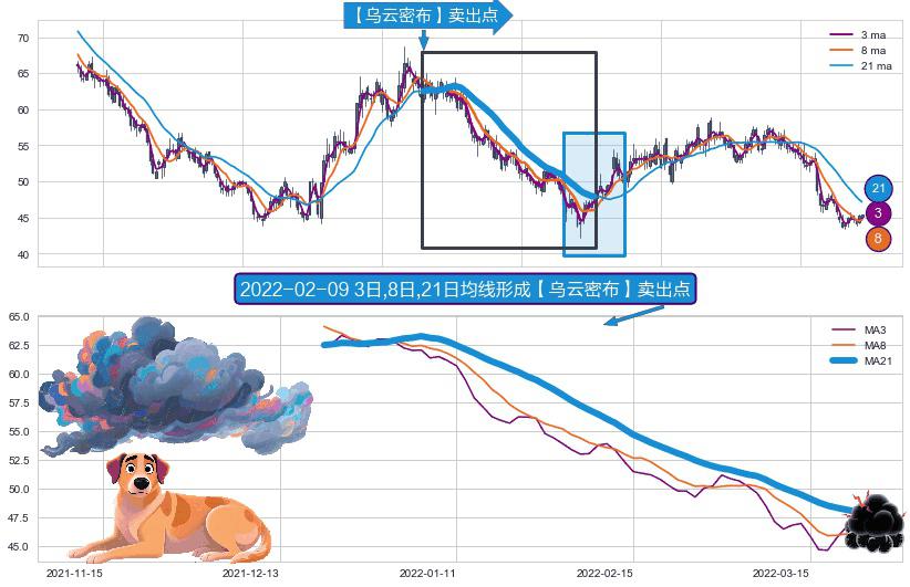 形态多维评估: ⚀ 2021-12-20日-2022-03-23日显现 3日-8日-21日均线 【乌云密布】卖出点 看空信号,后市看跌,卖出