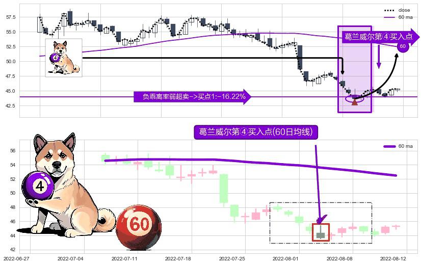 形态多维评估: ⚀ 2022-08-03-日显现 葛兰威尔均线 60日均线 第④买入点 下降趋势均值回复的短线反弹信号,后市看涨,买进信号