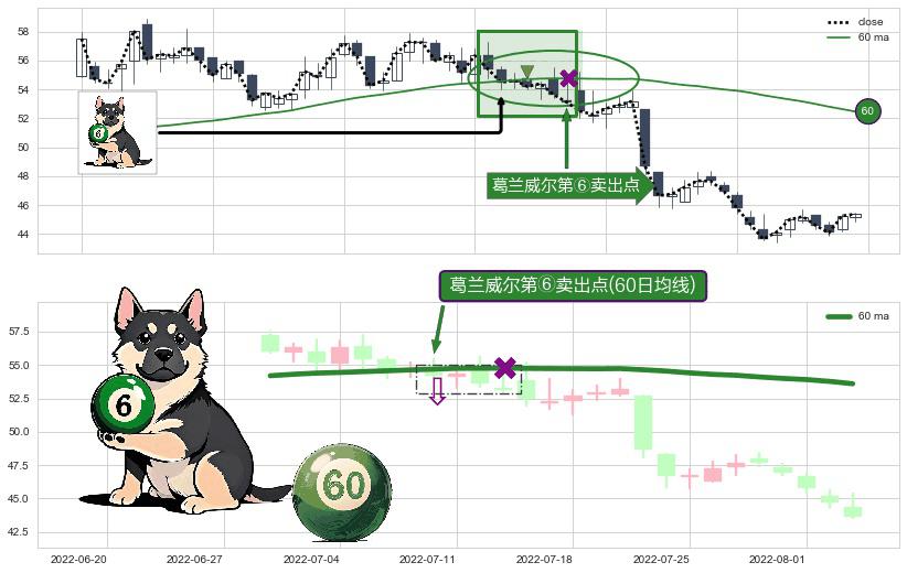形态多维评估: ⚀ 2022-07-08-日显现 葛兰威尔均线 60日均线 第⑥卖出点 走势反转见顶信号,后市看跌,卖出信号
